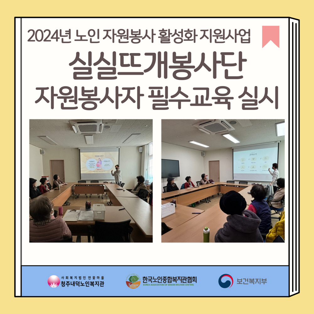 2024년 노인 자원봉사 활성화 지원사업 실실뜨개봉사단 자원봉사자 필수교육을 3월 13일(수) 10:00~12:00 까지 청주내덕노인복지관 1층 상담실에서 진행하였습니다.