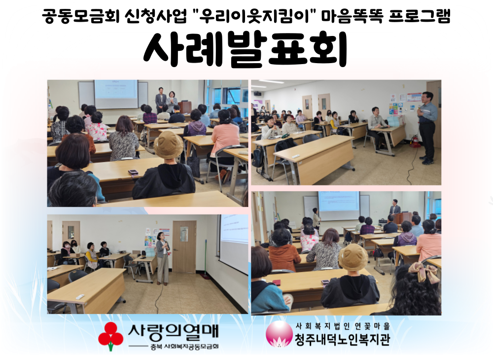 안녕하세요! 청주내덕노인복지관에서는 공동모금회 지원사업으로 진행되는 고독사 예방 프로그램 우리이웃지킴이 "마음똑똑"의 사례발표회를 성황리에 마쳤습니다.