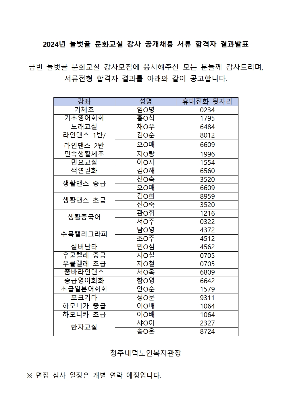 2024년 늘벗골 문화교실 강사 공개채용 서류 합격자 결과 발표